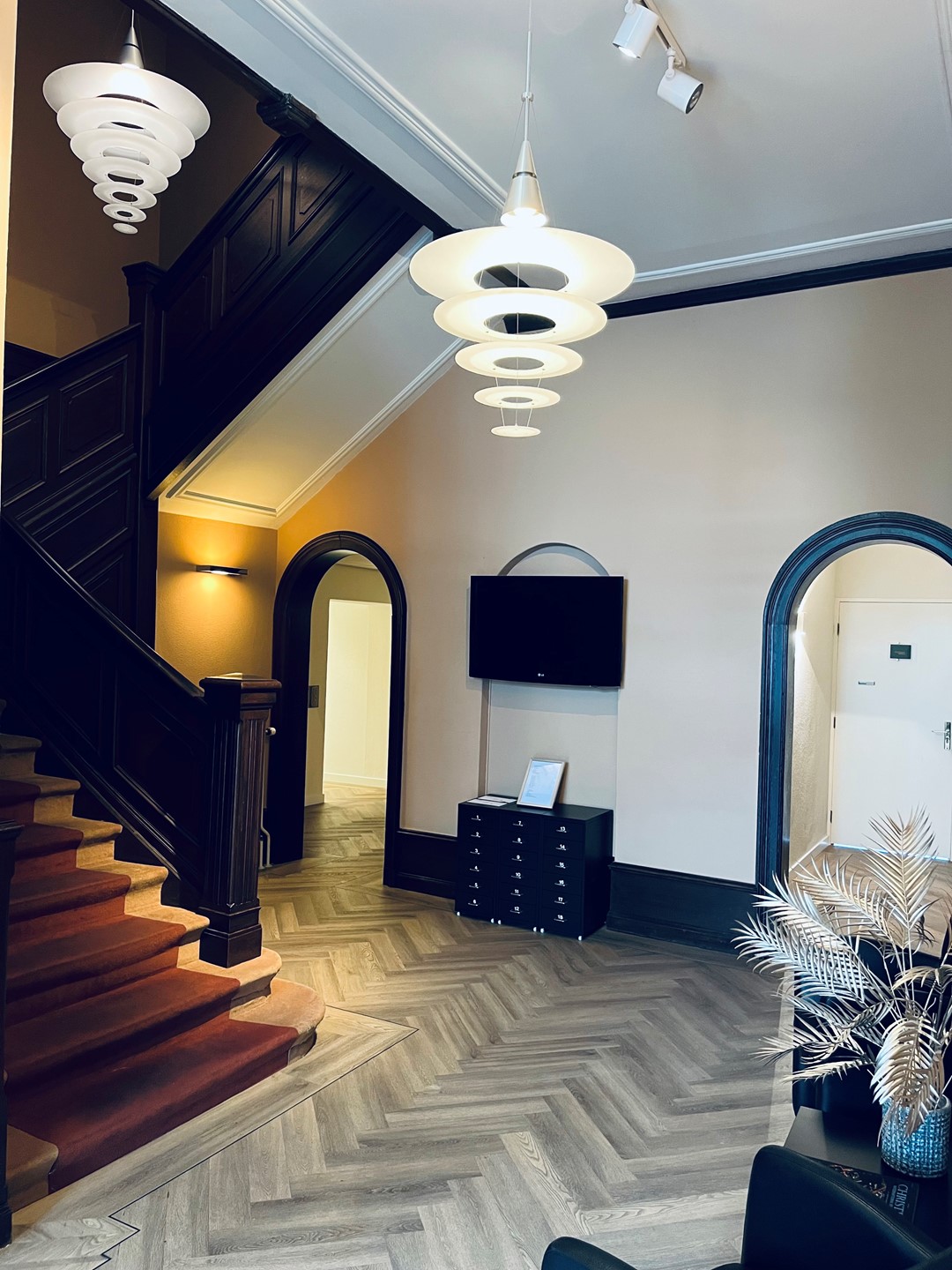De kantoorruimten zijn volledig gemoderniseerd, met behoud van originele details zoals hoge plafonds, ornamenten en royale raampartijen.